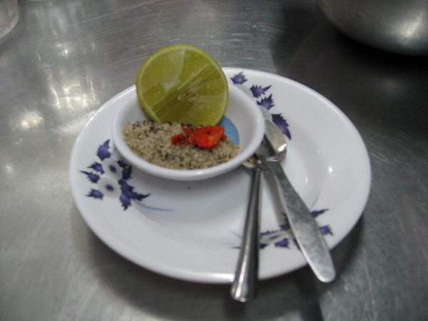 吃海鮮的佐料,胡椒鹽+辣椒+檸檬,旁邊是吃螃蟹的器具
