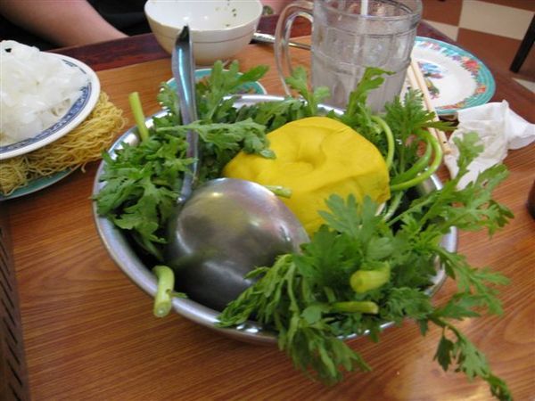 火鍋配菜,一樣有豆腐,這個青菜味道像台灣的萵苣,但是比較小,香味也比較重