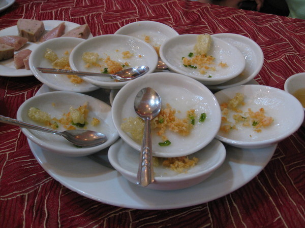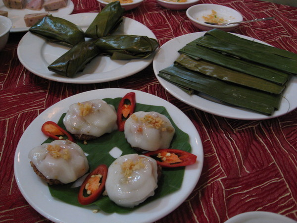 越南的道地小吃,白色的是米漿蒸出來的,配上蝦末跟一些我不知道的小配料