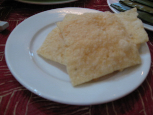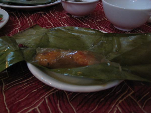 芭蕉葉裡頭包的有點像水晶餃,內饀一樣脫離不了海鮮,雞肉等等