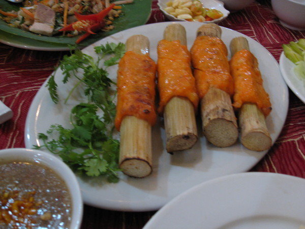 越南有名的甘蔗蝦,將蝦末裹在甘蔗上,再去烤,蝦肉吸收了甘蔗的甜味,再加上蝦的鮮味